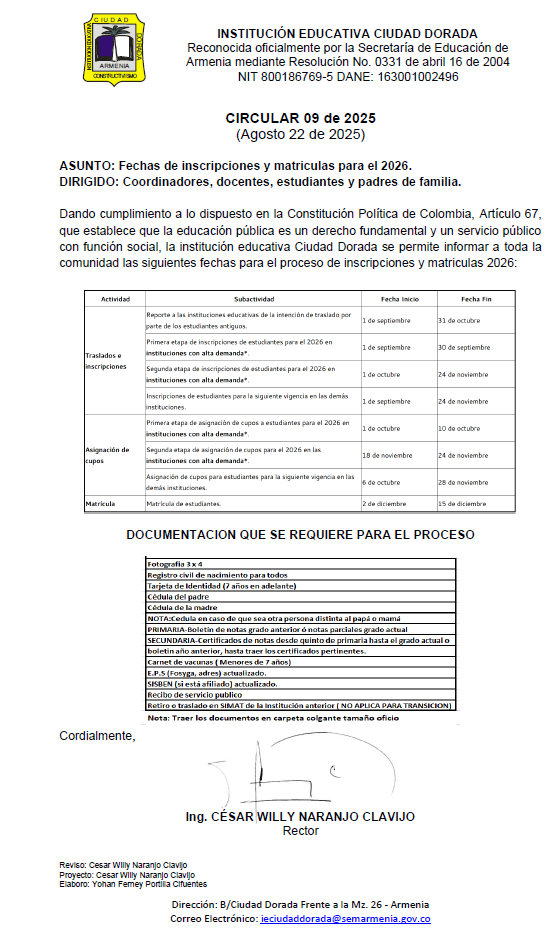 Circular 09 del 22 de Agosto del 2025. mediante la cual se establecen las fechas [...]