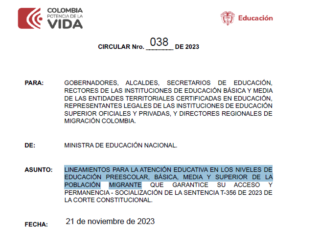 CIRCULAR 38 DE 2023-1 Mediante la cual se establecen lineamientos para la atención educativa en [...]